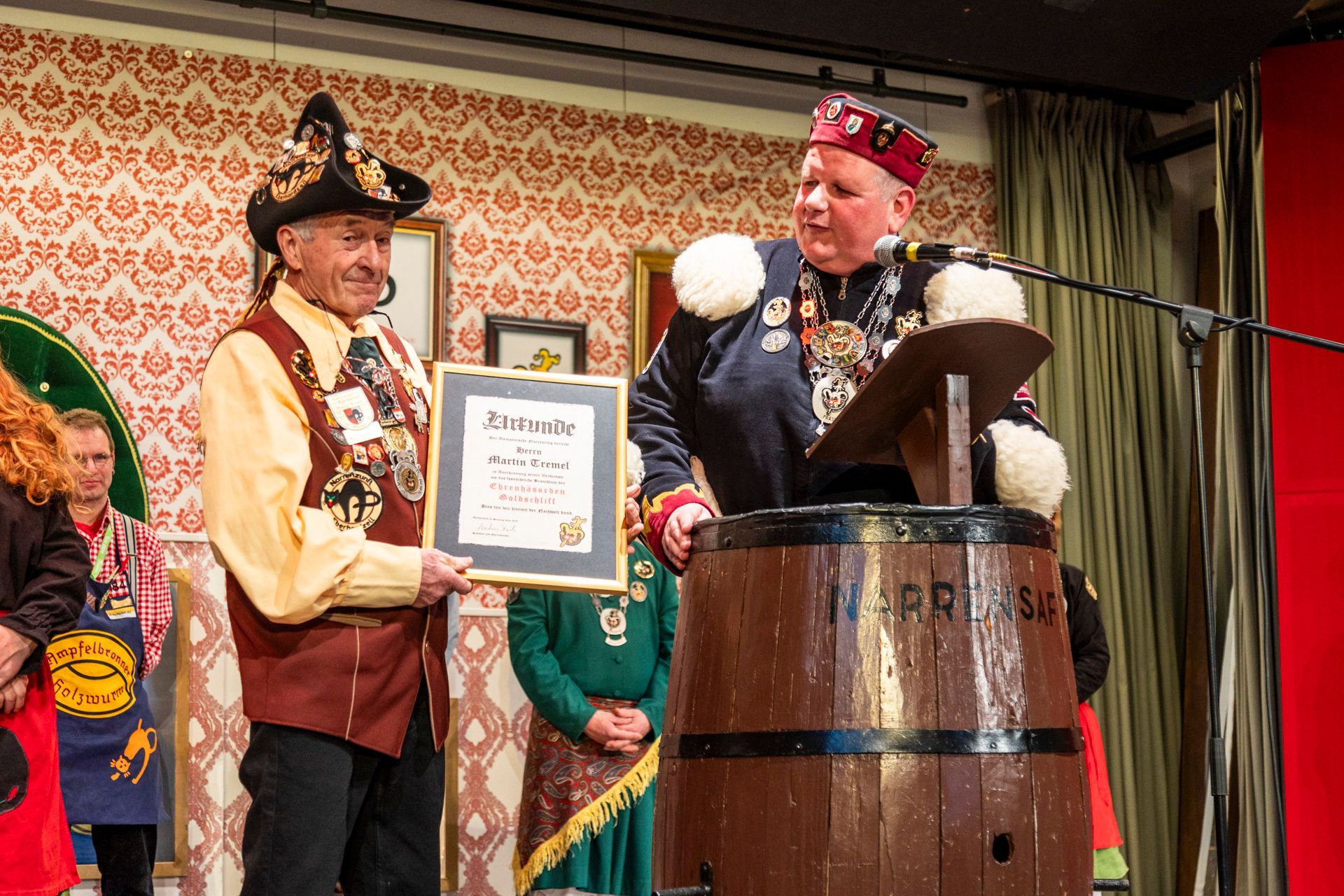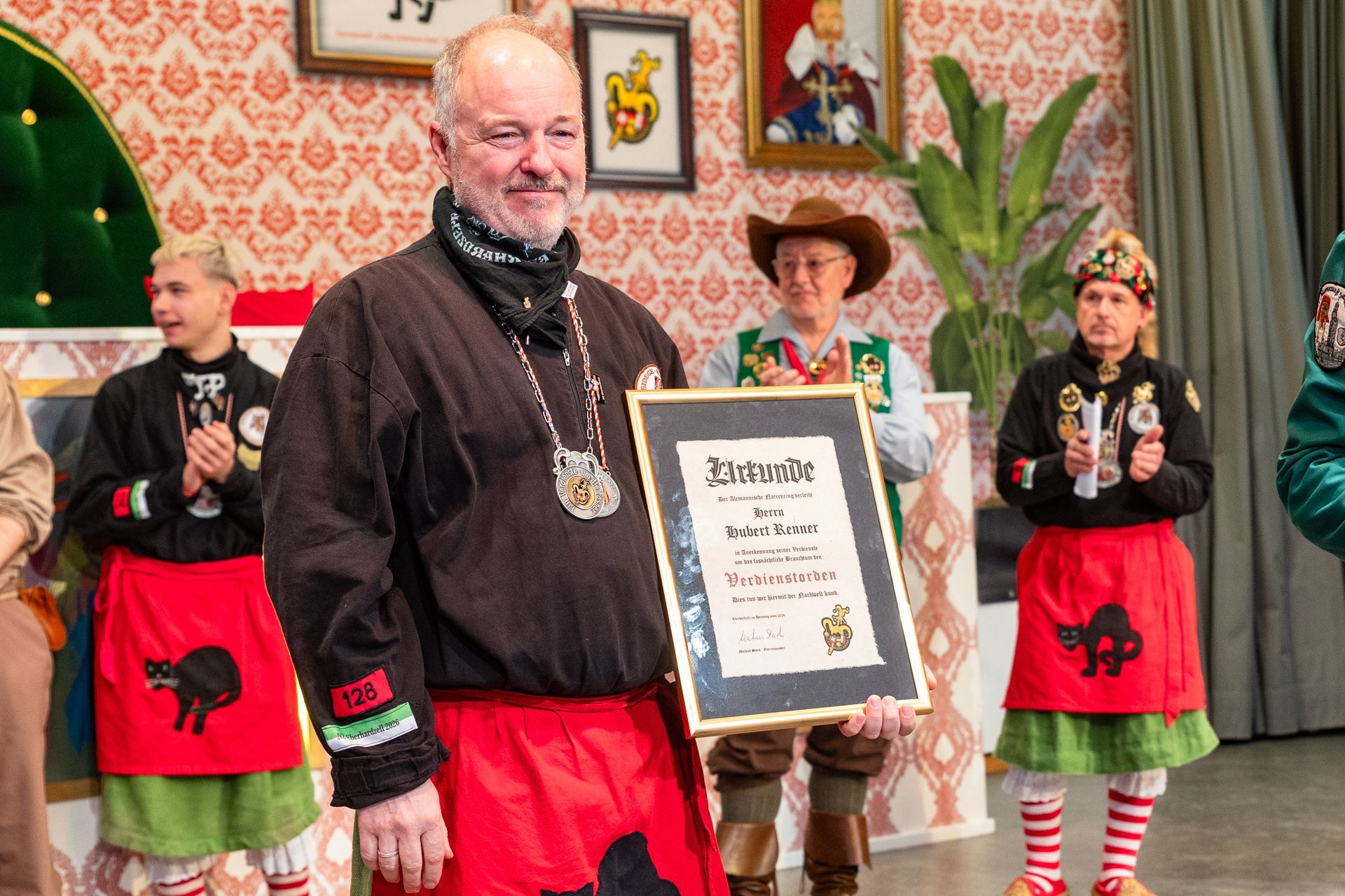Auf rund drei Jahrzehnte ehrenamtliches Engagement in der Narrenzunft konnte Jürgen Hanser, Oberzunftmeister der Region Allgäu beim ANR, bei der Laudatio für Hubert Renner zurückblicken. 1994 in die Narrenzunft eingetreten, war Renner von 1997 bis 2004 zunächst Mitglied im Hexenrat, von 2002 bis 2004 außerdem zweiter Hexenmeister. 1999 wurde er in den Zunftrat gewählt, dem er auch 27 Jahre später noch angehört. Dort ist Renner, der die Narrenzunft bereits zweimal als Präsident durch die Fasnet führte, für die Gestattungen aller Narrenzunft-Veranstaltungen ebenso verantwortlich wie für die Organisation der Bewirtungsstände am Eberhardzeller Narrensprung und das Zunft-Zelt am Stachus. Komplettiert wird sein ehrenamtliches Engagement durch den Vorsitz im Förderverein der Narrenzunft und die Organisation der Busfahrten für auswärtige Umzüge, bei denen Renner oft auch selbst als Busfahrer im Einsatz ist. „Hubbe ist immer zur Stelle, wenn eine helfende Hand benötigt wird“, fasste Jürgen Hanser zusammen und überreichte Renner den ANR-Verdienstorden.